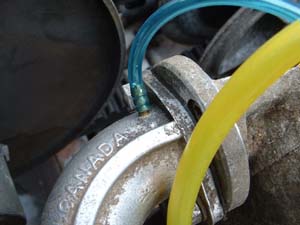 Pictured above is the Tillotson HL carburetor on my '71 Arctic Cat 303. This carb is a little odd because it has a pipe between the carb and engine. I've seen this sort of thing on Kohler engines too but with the carb pointed straight up. Anyway for the purpose of this installation I pulled the carb with the pipe from the engine. Then I drilled and tapped a 4mm-.70 hole in the pipe right by the engine and screwed in the barbed fitting and bolted the carb back up. . |